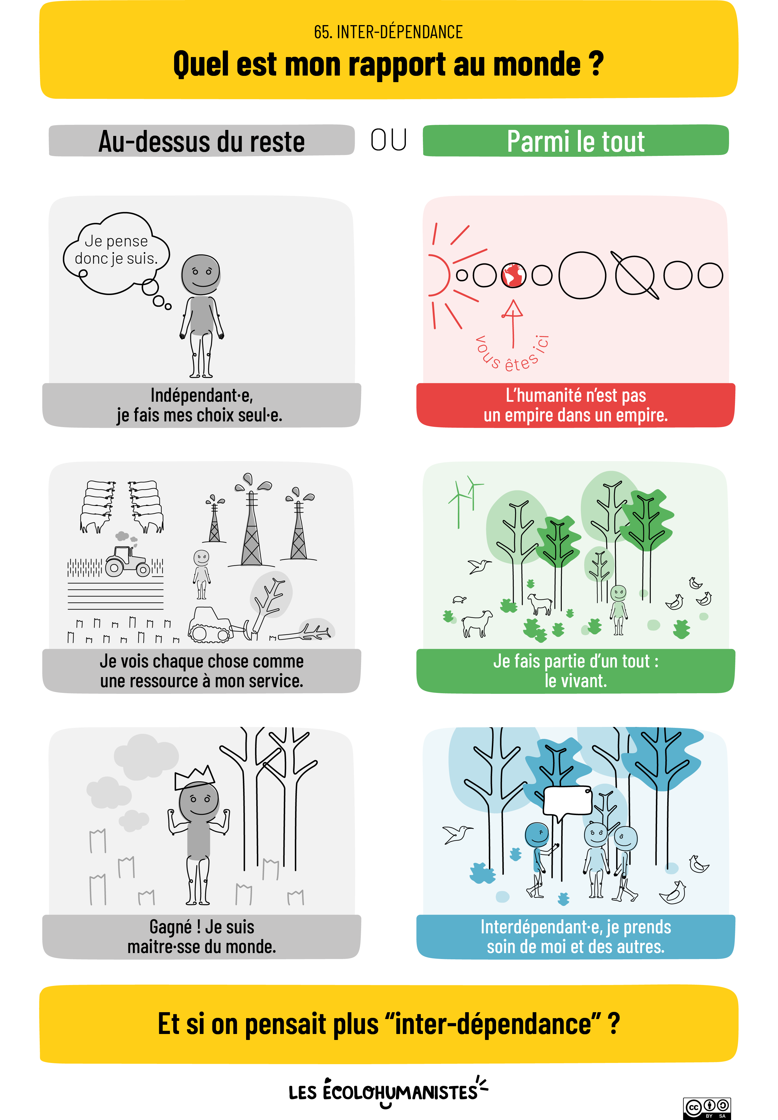 Quand on parle de « Je fais partie d’un tout : le vivant » dans la partie « Interdépendance » de notre infographie, nous faisons cette fois-ci un petit clin d’œil à un philosophe contemporain : Baptiste Morizot.