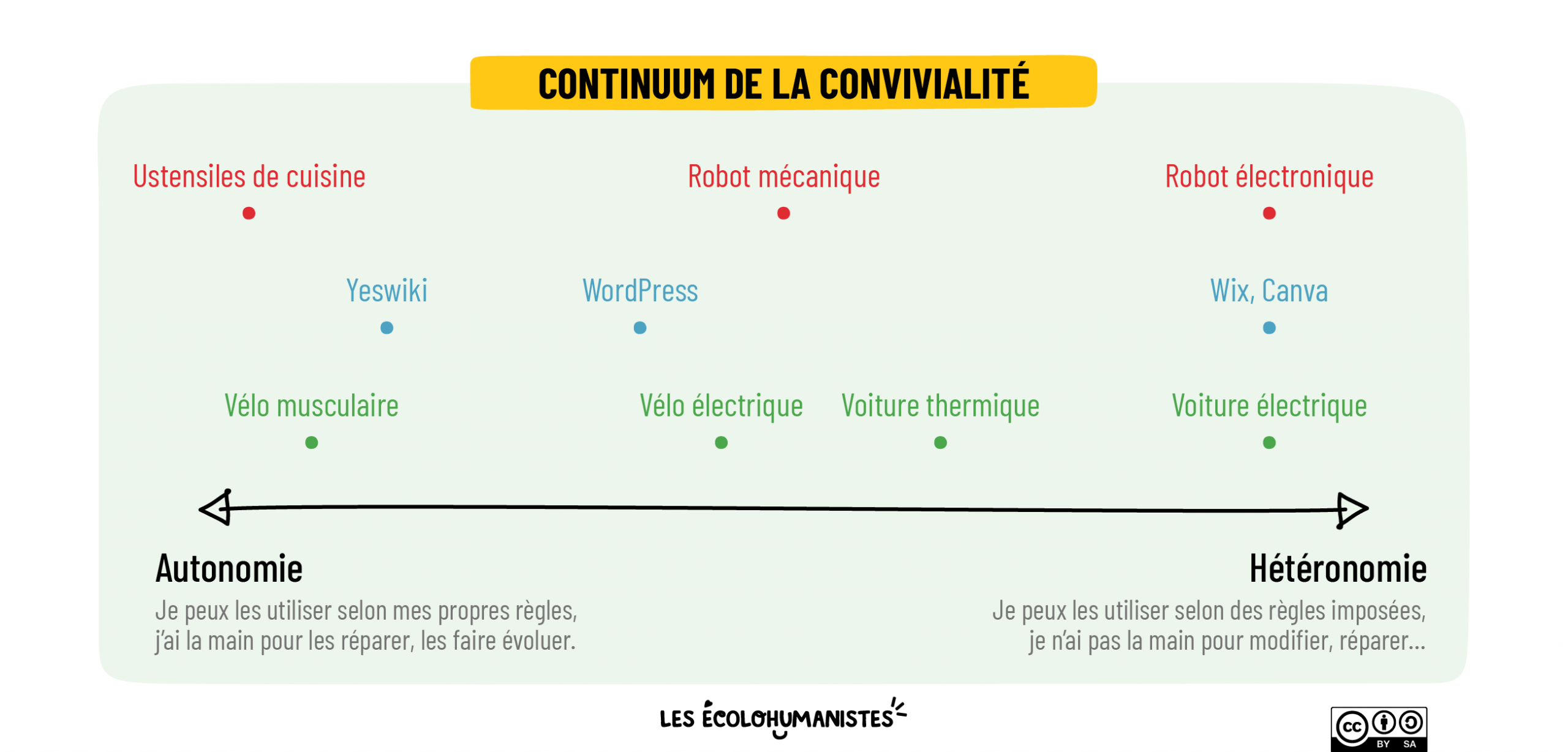 Une autre manière de définir la convivialité est d’opposer autonomie (qui vient étymologiquement de « qui se régit par ses propres lois ») avec hétéronomie (se voir imposer les lois d’autres). La convivialité penche plus du côté autonomie, là où la société et ses outils nous entraînent souvent vers l’hétéronomie.