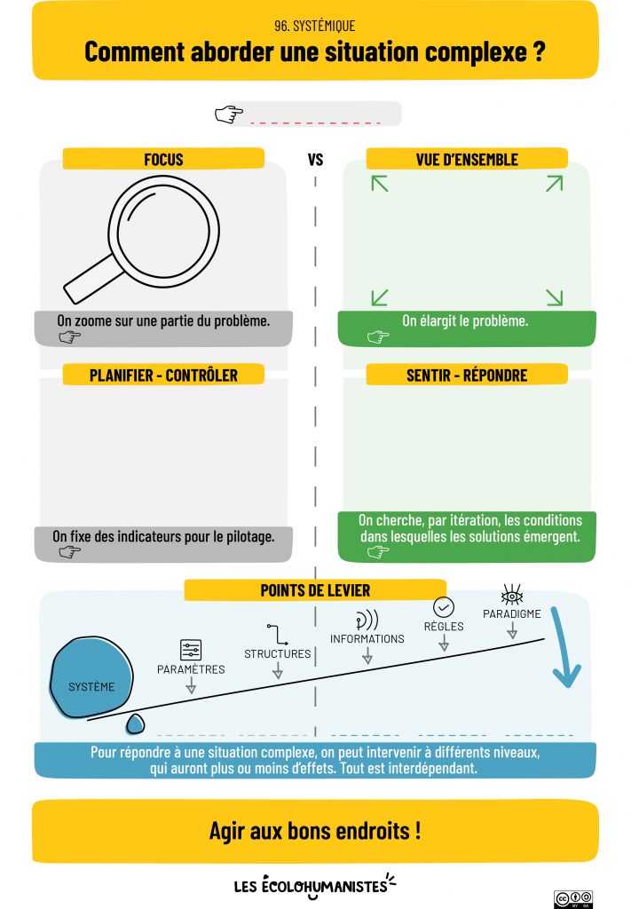 On comprend aisément qu’il est sensé de planifier & contrôler une situation que l’on peut comprendre dans son ensemble, même compliquée. Concevoir une voiture, c’est compliqué – pas complexe – on peut, par exemple, installer des airbags, sans effet sur le reste de la voiture. Mais face au changement climatique, nous conseillons plutôt de ressentir et répondre. Ainsi, face à notre incapacité à comprendre une situation complexe dans son ensemble, pas de condamnation à l’inaction ! Plutôt un pas de plus vers l’intelligence collective qui démontre toute son utilité.