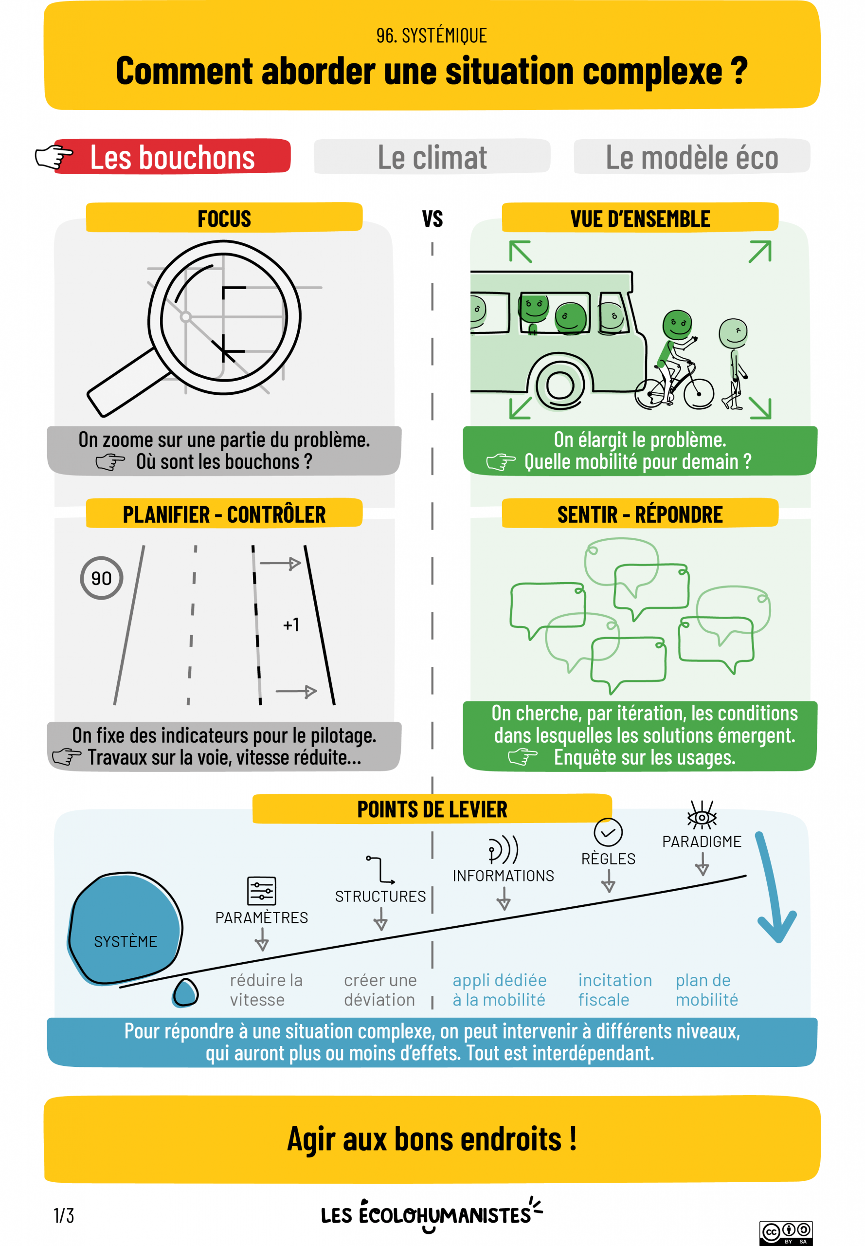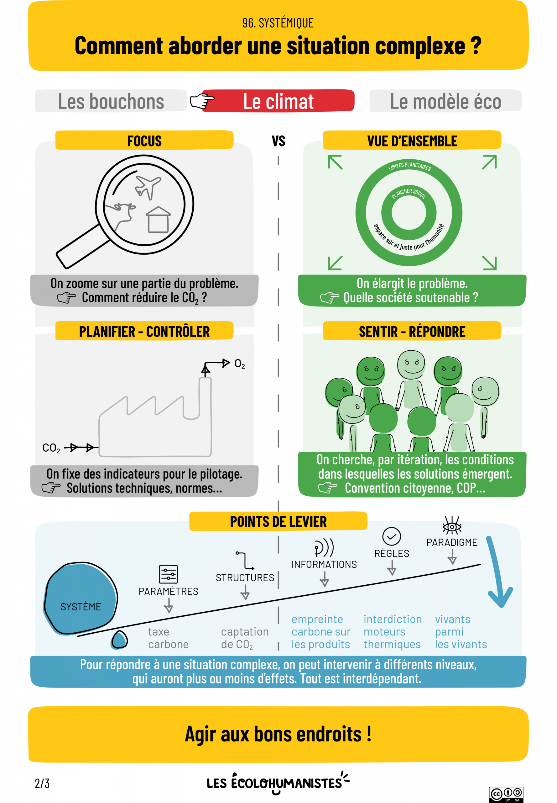 Mais, cette approche peut avoir quelques limites. On peut ne pas voir les conséquences négatives d’une action qui nous parait efficiente en un point du système. Un exemple renommé : l’effet rebond. On fait nos efforts sur la réduction de la consommation en essence des voitures pour limiter les rejets de CO2… sans voir que ça démocratise l’usage de la voiture, ce qui a pour conséquence plus de rejet carbone qu’avant.