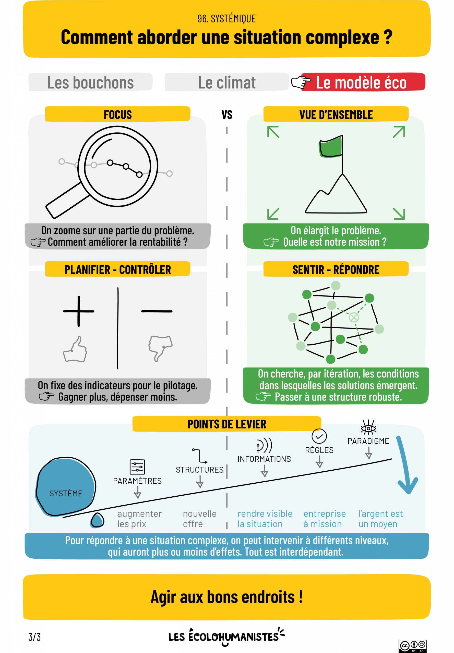On comprend aisément qu’il est sensé de planifier & contrôler une situation que l’on peut comprendre dans son ensemble, même compliquée. Concevoir une voiture, c’est compliqué – pas complexe – on peut, par exemple, installer des airbags, sans effet sur le reste de la voiture. Mais face au changement climatique, nous conseillons plutôt de ressentir et répondre. Ainsi, face à notre incapacité à comprendre une situation complexe dans son ensemble, pas de condamnation à l’inaction ! Plutôt un pas de plus vers l’intelligence collective qui démontre toute son utilité.