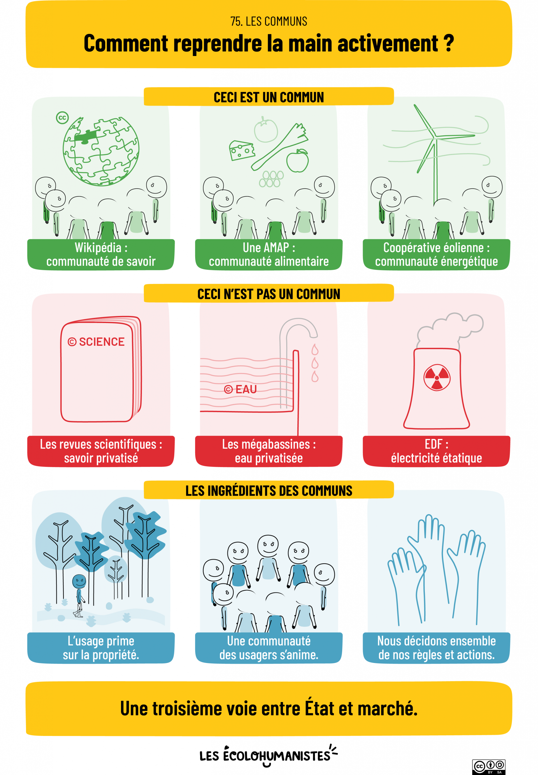 On tient à remercier Hervé Devalfard (chercheur sur cette thématique, qui vient de publier La société du commun aux éditions de l’atelier) et Marc Lourdaux (initiateur d’Échanges Paysans dans les Hautes-Alpes). Ils nous ont aidé à penser cette infographie, notamment autour de cette question des ressources. Si vous souhaitez aller plus loin sur le sujet, on vous conseille aussi cet article : « accueillir les non-humains dans les communs« .
