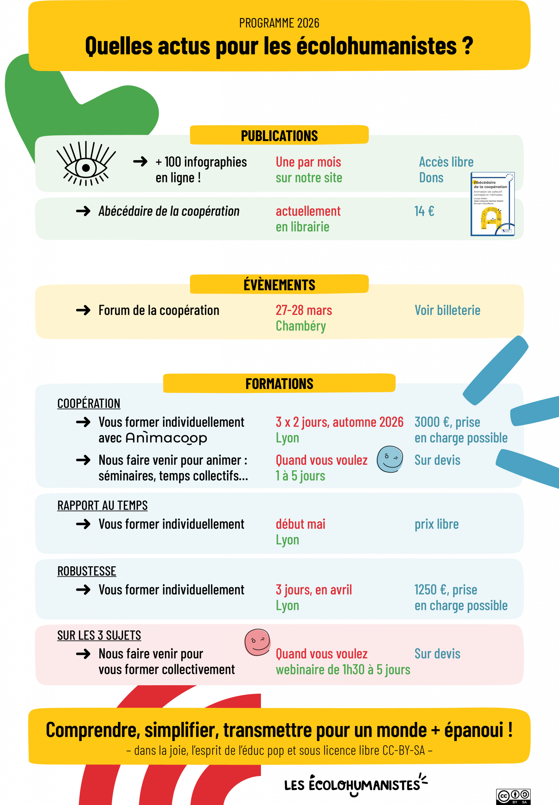 Tout ce que nous vous proposons ici est dans la lignée de notre intention : comprendre, simplifier et transmettre pour participer à un monde plus épanoui. La seule différence c’est que nous serons là, en chair et en os, pour vous accompagner, vous former, animer, en discuter… 🙂